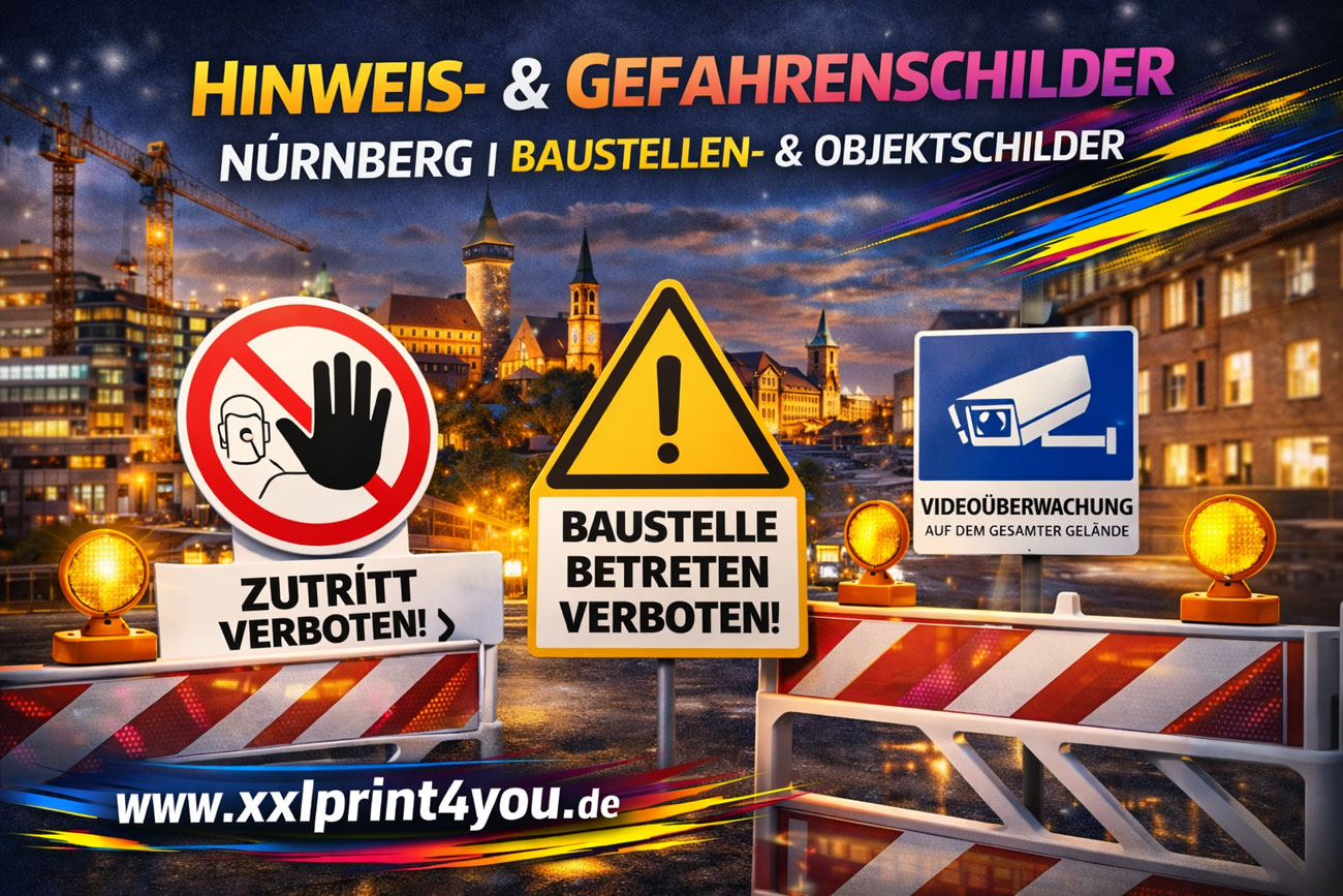Hinweis- und Gefahrenschilder sind ein wesentlicher Bestandteil der Sicherheits- und Informationspflicht auf Baustellen und an Objekten. Sie sorgen für Orientierung, warnen vor Gefahren und helfen dabei, Vorschriften und Sicherheitsmaßnahmen eindeutig zu kommunizieren. Wir fertigen Hinweis- und Gefahrenschilder für Baustellen und Objekte in Nürnberg und der Metropolregion – gut sichtbar, langlebig und auf den jeweiligen Einsatzbereich abgestimmt.