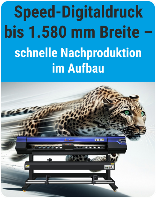 Für besonders kurze Reaktionszeiten setzen wir auf Speed-Digitaldruck bis 1.580 mm Breite. Ideal für kurzfristige Änderungen und fehlende Elemente während des Aufbaus.